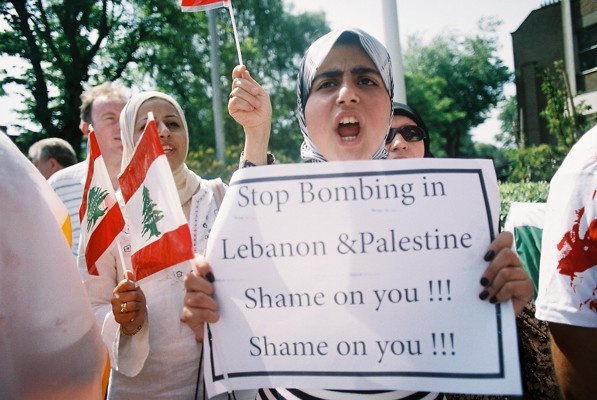 The IPSC “die-in” was co-ordinated with another demonstration organised by the Lebanese and Palestinian communities in Ireland, who marched from Dublin city centre out to the embassy, twenty minutes away in Ballsbridge, and were supported by recent Irish evacuees from Lebanon, and by former Irish Defence Forces personnel who had served with the U.N. there. |