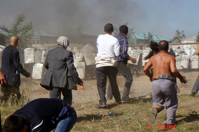 At 6 o'clock a squad of 60 riot police attacked Bakai, but residents succeeded in holding them off, using stones and bottles of petrol. Three riot police were very badly burned. In response the police pulled one of the defenders from his roof, threw him into a large puddle and kept him as a hostage and withdrawal of the police cordons.