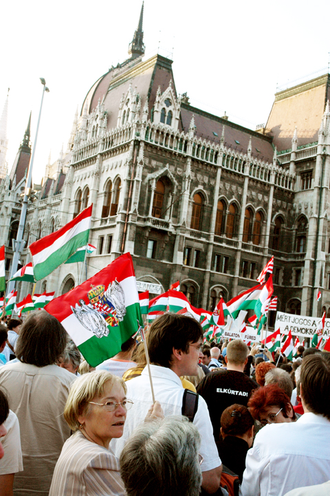 This is not the 'Left' protesting in the streets but mostly the nationalist Right (the 'Left' is the government but theres nothing 'Left' about it) - members of Jobbik and MIEP [ http://jobbik.hu / http://www.miep.hu ] are most likely there tonight. I don't like them.