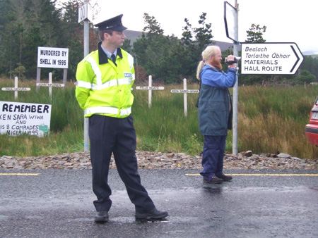 At this stage, it’s important to highlight an issue of concern to protestors and local residents. The first photo below is of two plain clothed individuals on-site at Bellanaboy this morning. They are Police Officers Sergeant Gill from Belmullet and our unidentified Special Branch ‘Protest Specialist’ from Dublin. There have always been issues of Health & Safety surrounding this proposed project as a whole. With regard to the site at Bellanaboy specifically, major problems and breaches of regulations were identified as a result of a ‘walk on’ site inspection by Shell to Sea local residents last winter. A Shell confidant confirmed to Shell to Sea that measures to improve on these constant sub-standards, historically associated with Shell always, were never taken until local Shell to Sea residents, after completing ‘Safe-Pass’ courses, continued to demand and secure their rights to continually enter the site for the purposes of monitoring site security and safety first hand.