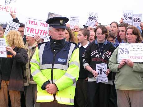 Indications are that later this morning Shell and their state security puppets intend to get really stuck in to lawfull protestors at Bellanaboy. The garda filming of protestors yesterday morning was an obvious attempt to indentify individual's who they feel they can target for extra special treatment when events kick off in only a few hours from now. Similar tactics have been employed in the recent past at other peacefull demonstrations. The turn-out this recent week has been impressive given the often bad weather and early hours. We will show Shell that were are determined as ever to halt this attack on our families safety, heath, and local environment!!