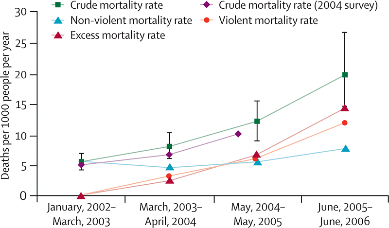 They identified more than 12,000 family members and tracked those who had died over an interval that spanned both pre- and post-invasion periods. The Iraqi interviewers spoke fluent English as well as Arabic, and they were well trained to collect the information they were seeking. They asked permission from every family to use the data they wanted. And they chased down death certificates in over four out of five cases to make sure that they had a double check on the numbers and causes of death given to them by family members.