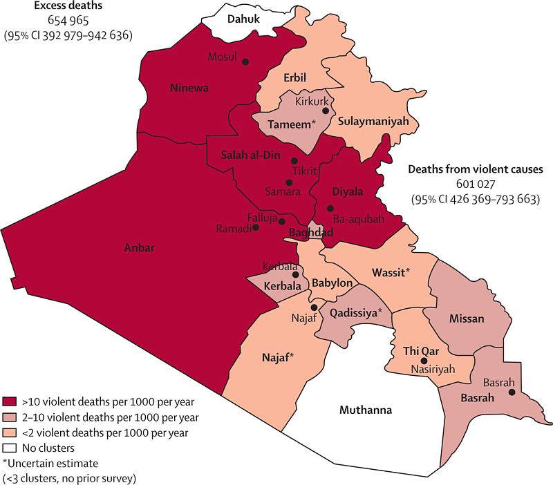 Jump To Comment: 1 2 3 4 5 6 7 8 9 10 11 12 13 14 15 16 17 18 19 20 21 22 23 24 25 26 27Mortality rates in Governorates with fewer than three clusters were confirmed with 2004 survey data; estimates for provinces with fewer than three clusters that could not be confirmed are potentially uncertain due to the small sample size.