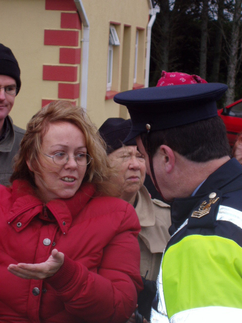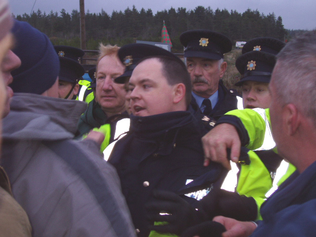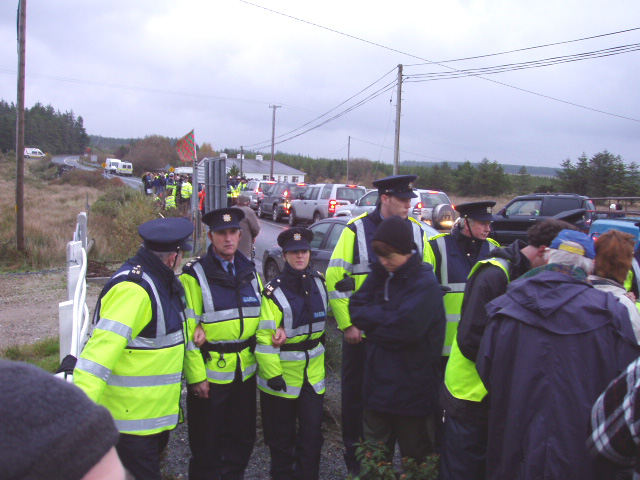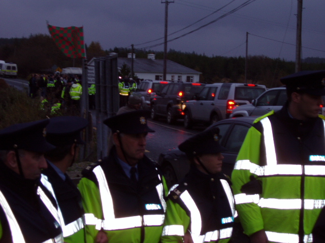 Growing more and more frustrated, and without any indication as to why they were not being allowed to march, a number of people decided to walk through the adjacent bogland and assemble further down the road towards the Shell site. Many of these people were batoned by the gardaí.