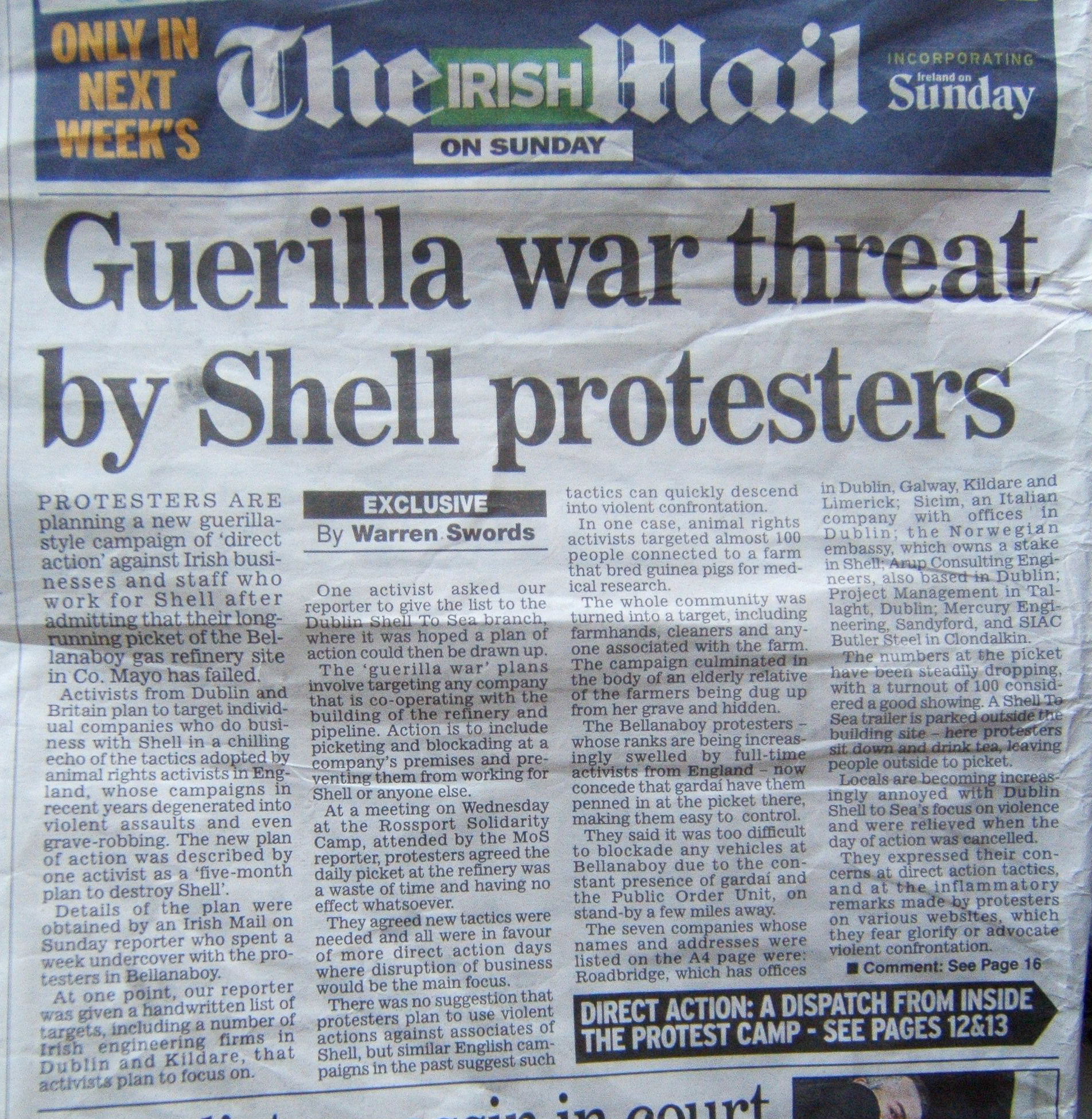 On page two readers were treated to the escapades of Mr Swords in his time “undercover” in Rossport. He opens his “expose” against the camp saying that we are going to launch a similar style attack on Shell as was waged by the SHAC campaign against Huntington Life Sciences- an allegation which is baseless and without truth. The attack opens ironically by acknowledging the non-violent nature of the camp but still goes into enormous detail of the Huntington life sciences campaign. The link between the Shell to Sea campaign and the campaign around Huntington Life Sciences is unknown to everyone with the exception of Mr Swords. Its relevance to Rossport is still baffling; he starts by distancing the camp from violence but presumably in an attempt to find guilt by association or in this case guilt by disassociation he writes about it extensively anyway. The link between the SHAC campaign and Shell to sea is imaginary.