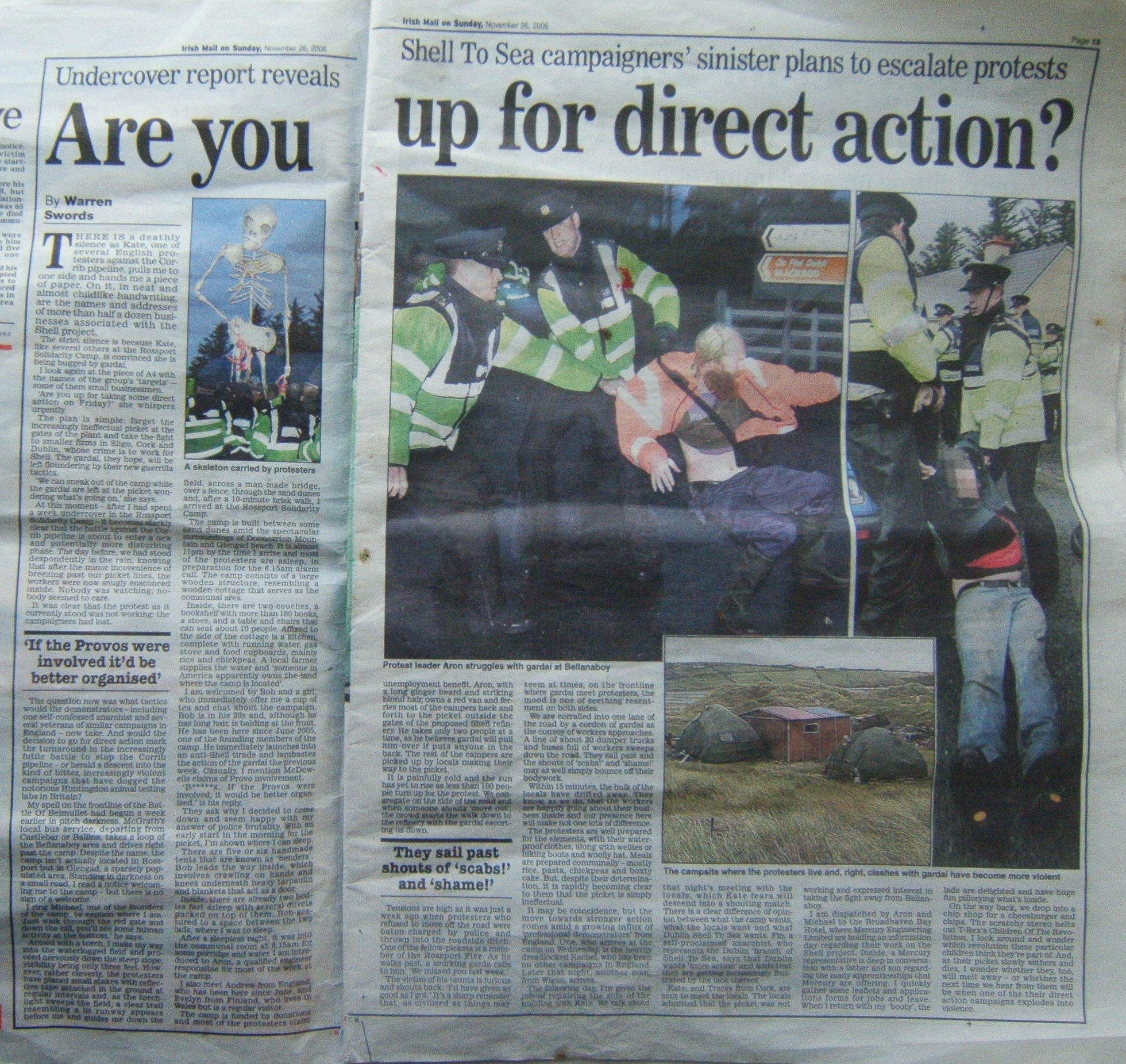 One of the most vicious and personalised attacks appeared in the Mail on Sunday. The Mail on Sunday’s journalist Warren Swords or “Ross” as Rossport Solidarity Camp knew him, allegedly infiltrated the camp and proceeded to write an article attacking the camp based on outright lies, guilt by association and insinuation.