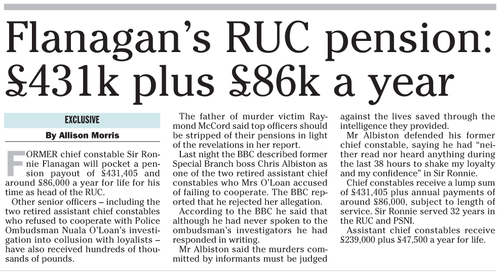 Former head of RUC Special Branch well paid - as was UVF informer killer Mark Haddock (by 'Sir' Ronnie's RUC)