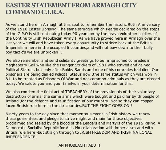 I'm fed up listening to people like McGuinness and his lackeys claiming that they fought the war against the Brits. The Fact is that many of those who now oppose the $inn Fein Sell out were the most active in the war. Dolorous Price, Darky Hughes, Gerry McGeough and countless ex-blanket men like Mackers who suffered with Bobby and the lads in Long kesh.