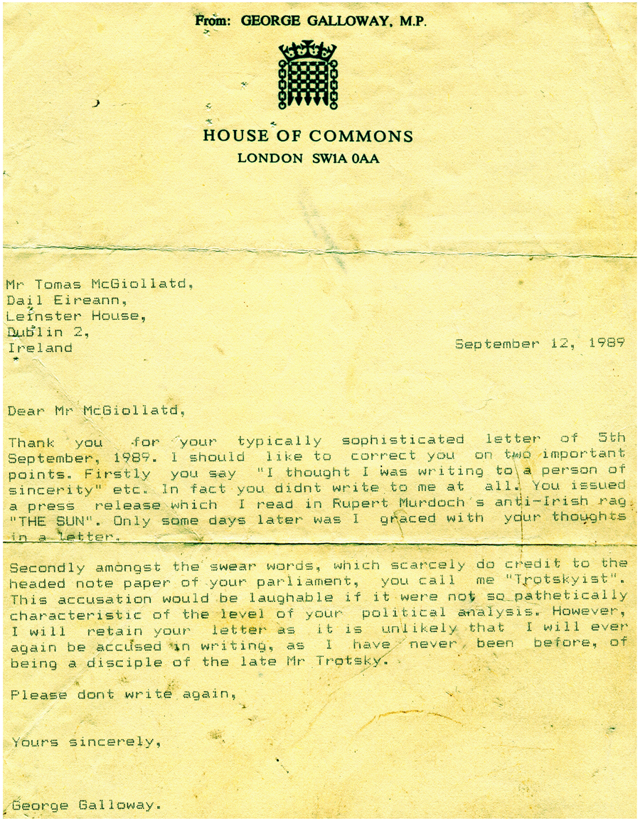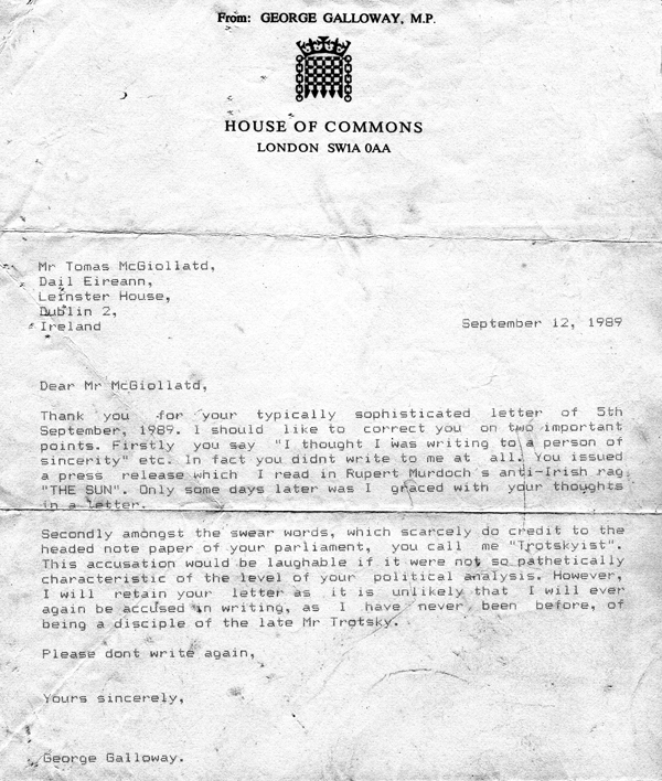 Tomás Mac Giolla stepped down as President of the Workers' Party in 1988. The above letter is dated September 1989 by which time a certain P. de Rossa held that position - around the same time he wrote a certain letter to Moscow....