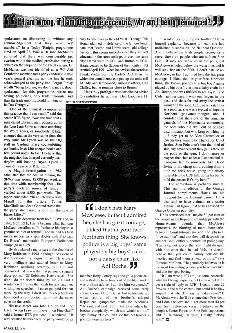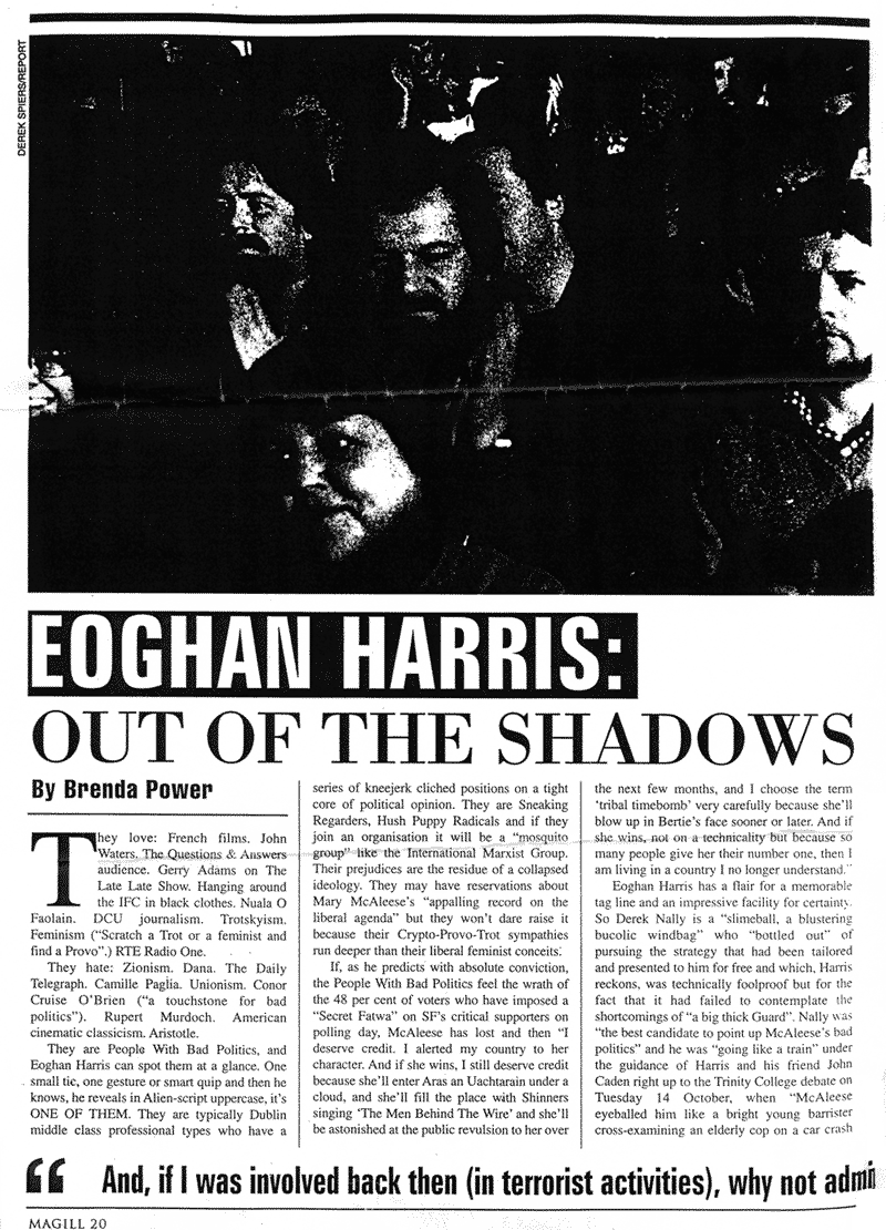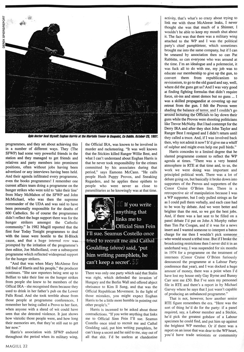 It may have escaped your notice but Eoghan Harris has not been associated with the Workers' Party for nearly 20 years. He resigned from it after it refused to publish a document he had authored under the title "The Necessity of Social Democracy". which proposed the party abandon socialism and take the social democratic route. Since then Harris has ploughed through a plethora of candidates and parties from Mary Robinson, to Fine Gael and the Ulster Unionists. By all means attack Harris and, if you must, the Workers' Party but please do not make the deliberate 'mistake' of tarring the WP with Harris's bile since he left. The Workers' Party is a socialist republican party and has no intention of departing from that position however much others (many of whom have now abandoned their holy grail of militant nationalism for their Armani suits) would like to portray it.