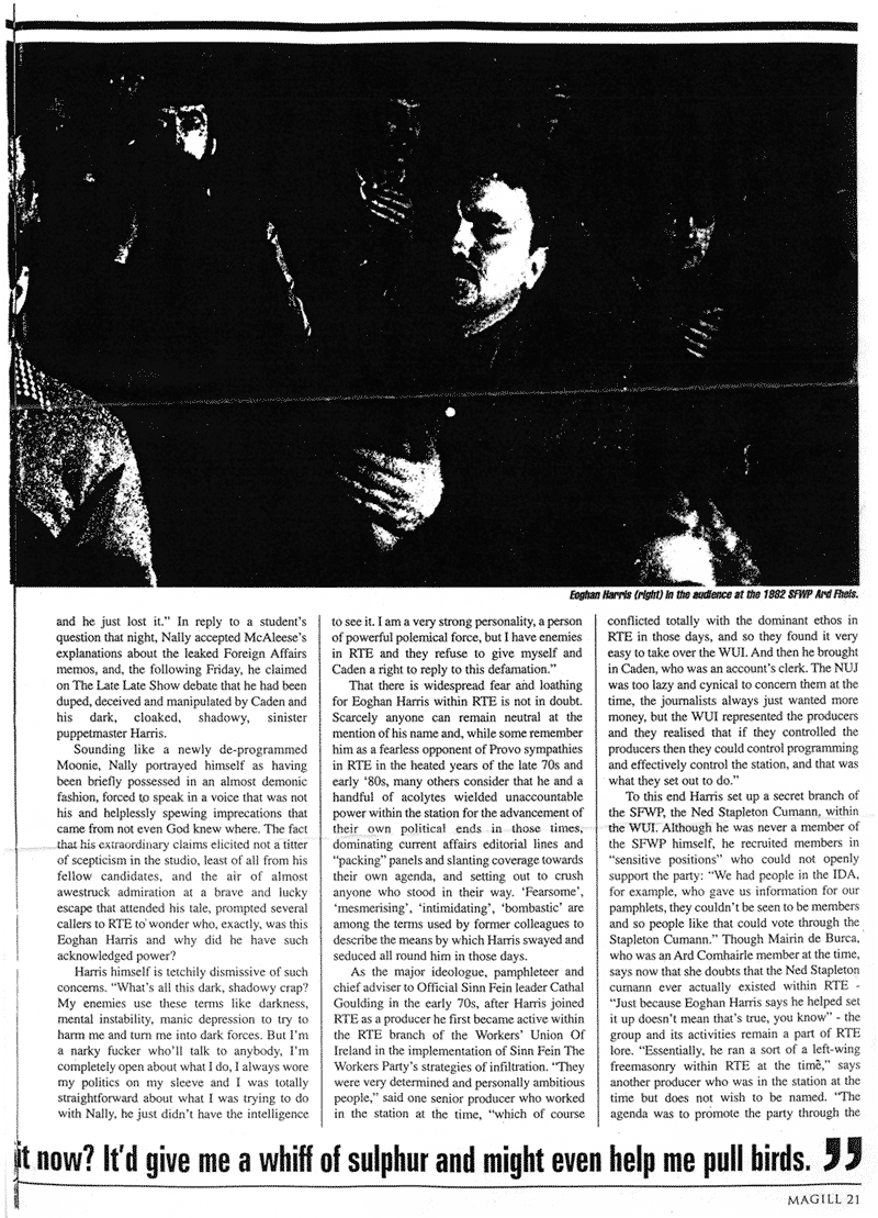 riddle me this? If the stickies had such a strangle hold on RTE how come the Today Tonight shows on the shady misdeeds of the WP in NI was aired? The shows were the start of the end of the WP and damaged their electorial successes significantly. I'm not saying that they didn't have influence in RTE but it has been exagerrated out of all proportions. Reading the above smacks of someting Harris would have concocted himself when he was on his "Provo Hushpuppies" rant against RTE. JM has way too much time on his hands.