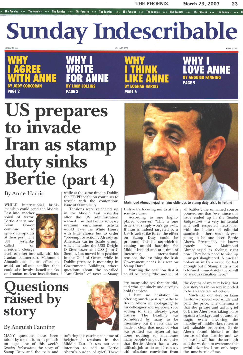 [Note: Interesting story in today's Phoenix magazine on the Sindo’s increasingly hysterical anti stamp duty campaign. Harris and ex-wife, Sindo Deputy Editor Anne Harris (engaged to Editor Aengus Fanning), are trying to sell their multi-million Euro pile in Dun Laoghaire (lavishly profiled in the Sindo property section). The campaign, if successful, will personally benefit those leading it. Is there a question of ethics here? Can Eoghan Harris spell the word? Imagine if Ray Burke lead a campaign for his own personal financial benefit. Where is the Press Council when we need it? Can complaints be retrospective?]