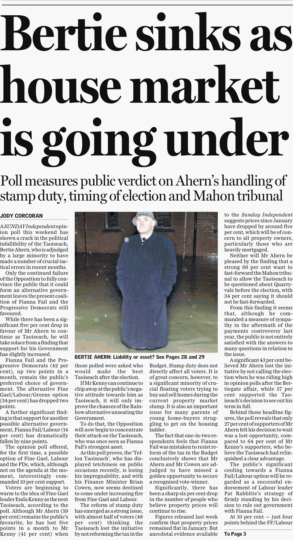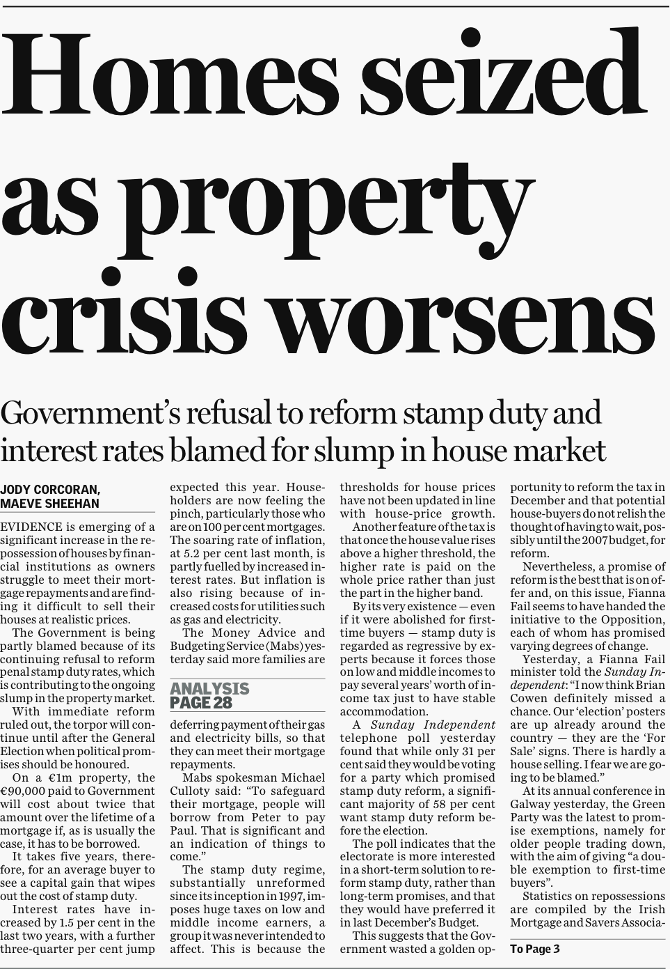 Morning Ireland finally faces a political fact that Harry McGee failed to face last Sunday: that stamp duty is not simply something the Sunday Independent ‘bangs on about’.”