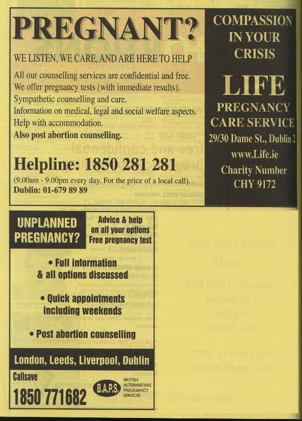 Throughout the article, you will notice that we generally refer to the clinic in question as “the agency”. This is because it has no permanent name; following incidents that generate bad publicity, it changes its trading name, shop front, and sometimes even its location. The agency has had to change its name many times but generally uses a name beginning with ‘A’ (A Choice for Women, Aadams, Alpha etc) so they appear first in the phonebook. You can find the current advertisement for the agency in the Family Planning section of the phonebook – it is the largest advertisement in the section and states that it provides “all options” to women in crisis pregnancy situations. It also claims to have offices in “London, Liverpool and Manchester”, obviously implying that they are linked to abortion clinics in the U.K. In addition to this, it says that they offer “post-abortion counselling”. The layout and format of the ad are almost identical to those of genuine crisis pregnancy agencies – but their one is by far the largest. However, the advertisement for the agency differs from most of the other family planning advertisements in that it has no address, only a telephone number.