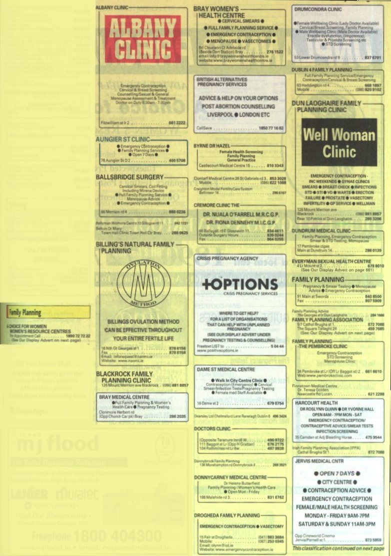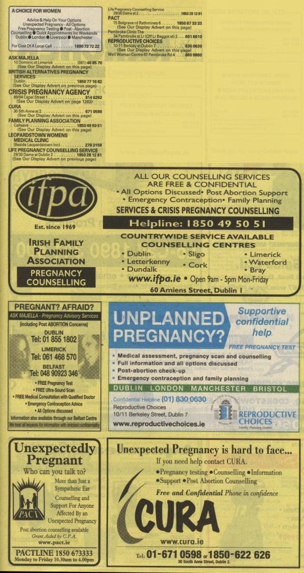 details the reliances of these agencies on ultrasound scans to get women who wanted to have abortions to change their minds. One group of these American "Pregnancy Resource Centres" has a "Worldwide Directory of Pregnancy Help" on its website. Here's the site – search for Ireland at this link.. http://www.heartbeatinternational.org/worldwide_directo...y.asp