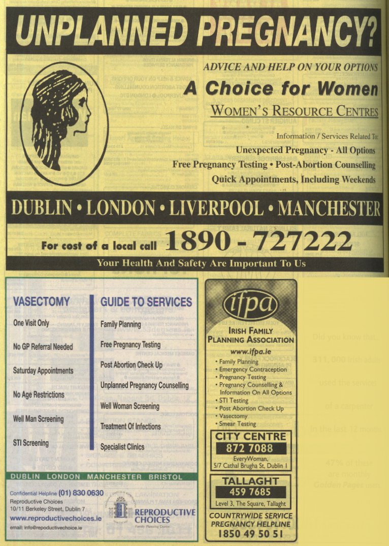 “Women taking calls to the Aadam's advertised phone numbers offered appointments for pregnancy counselling at its address when contacted last Saturday and Sunday. Callers to these numbers are not told that the counsellors are anti-abortion. On Friday a call to a different number led to an appointment at the same address. Asked if "all the options" would be discussed, the woman who took the call said: "You wouldn't believe the number of people who are suing abortion clinics in England because they are not given the full facts. The counselling is based on all the facts."” – The Irish Times