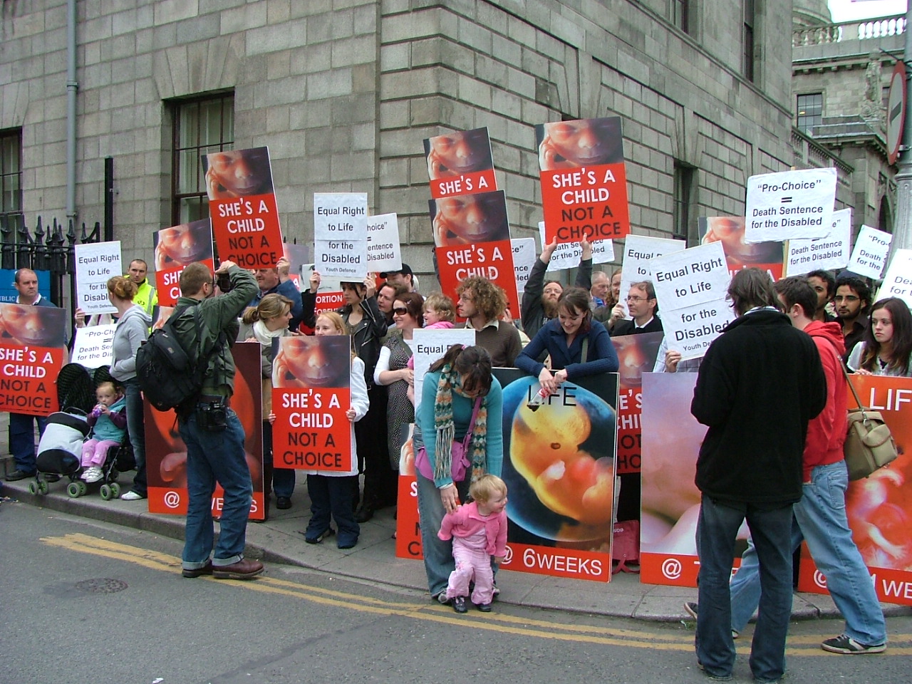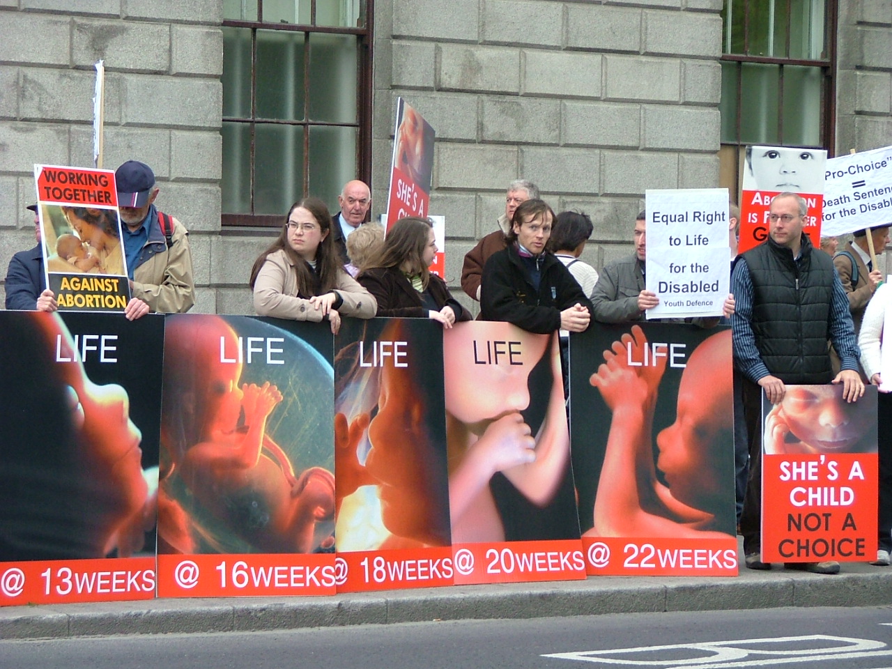 The pro-life movement attempted a major mobilisation outside the four courts today. They wanted the state to prevent a 17 year old girl carrying a foetus which was destined to die immediately after birth, from travelling to England to have an abortion. Approximately 50 pro-lifers, again bolstered with small children and babies, and with a large number of large colour posters, gathered outside the four courts. As soon as the verdict was known, they packed up and disappeared. A pro-choice rally also mobilised to support her right to travel, again consisting of approximately 50 people.