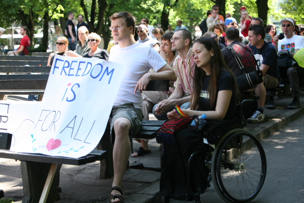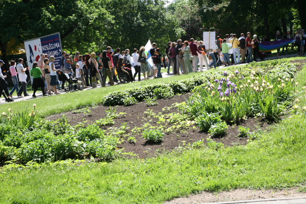 from one point of view, it's kinda sad, that instead marching in the streets, people had to march in a park behind the fences, but from other i'm really glad it happened at all. gay pride march in lithuania was banned by city council at all. and you should have seen that massive homophobic campaign that boneheads were doing there when council was considering the decision...