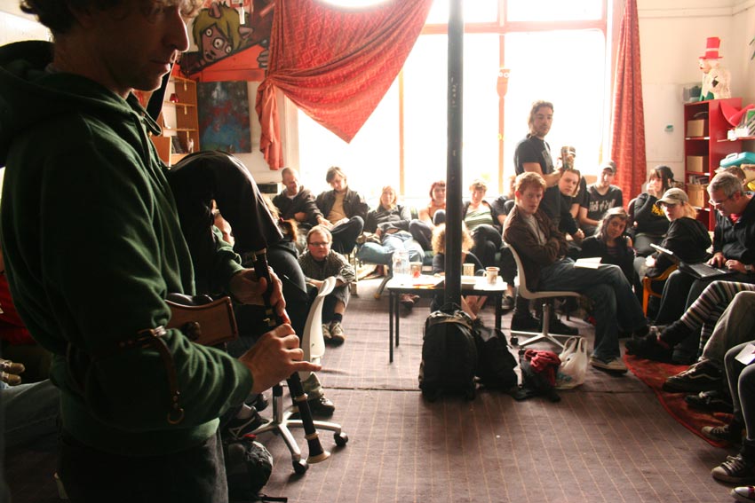 It's also being used for arts/crafts workshops, screen-printing, banner-making and bike workshops. Entertainment includes a weekly movie night on Wednesdays (on a 10-foot by 20-foot screen), a contemporary storytelling night (http://www.indymedia.ie/article/84004) about once a month and regular gigs and socials. Last Saturday (September 15th) saw Spraoi For All hold the centre's first all-ages gig (http://www.myspace.com/spraoiforall).