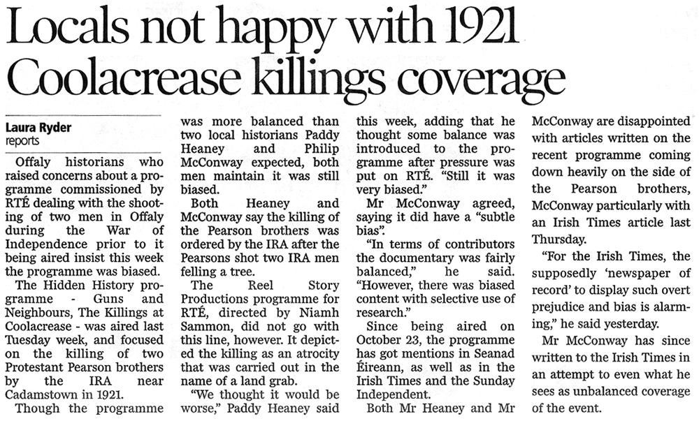 This documentary is about an execution by the IRA, on June 30 1921, of the brothers Richard and Abraham Pearson of Coolacrease, near Cadamstown, Co. Offaly. In 2002 local historian Paddy Heaney gave the first published history of these events in his book At the Foot of Slieve Bloom, describing the Pearsons’ active involvement on the side of the Black and Tans. In 2005 Alan Stanley of Carlow published I Met Murder on the Way. In it the executions are portrayed as sectarian murder in furtherance of a land-grab during a bigoted anti-British rebellion. This was picked up by Eoghan Harris who published two Sunday Independent articles in October 2005 highlighting the religious aspect – the Pearsons, he says, were other-worldly, pacifist Amish types brutally murdered by savage, sectarian monsters intent on ethnic cleansing.