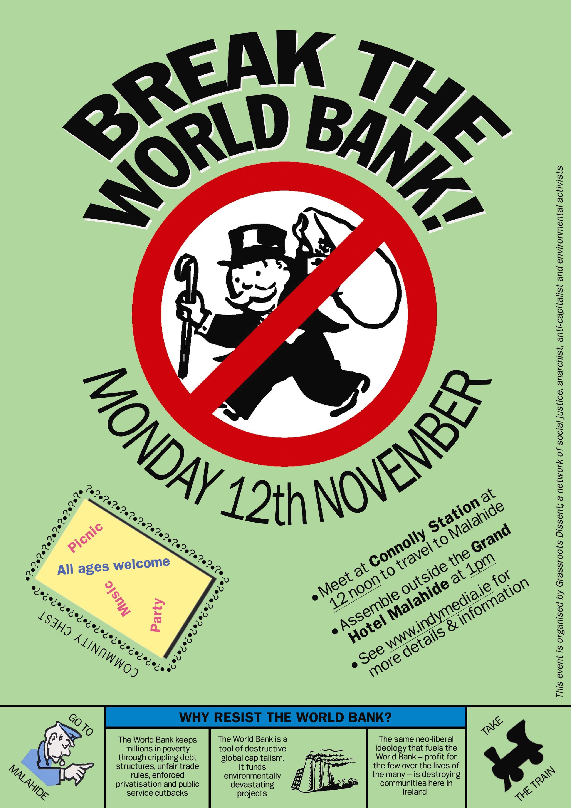 So following various emails sent out on the Grassroots Dissent mailing list* suggesting a meeting time and place, a bunch of us got together in mid-October to discuss the point and possibility of organising an event that would mark the meeting of the World Bank in Dublin on November 12th and 13th. Since we all agreed that the strength of counter-summit protests is located in the potential for outreach we decided to hold an info tour on the model of development enforced by the World Bank and the Bretton Woods institutes.