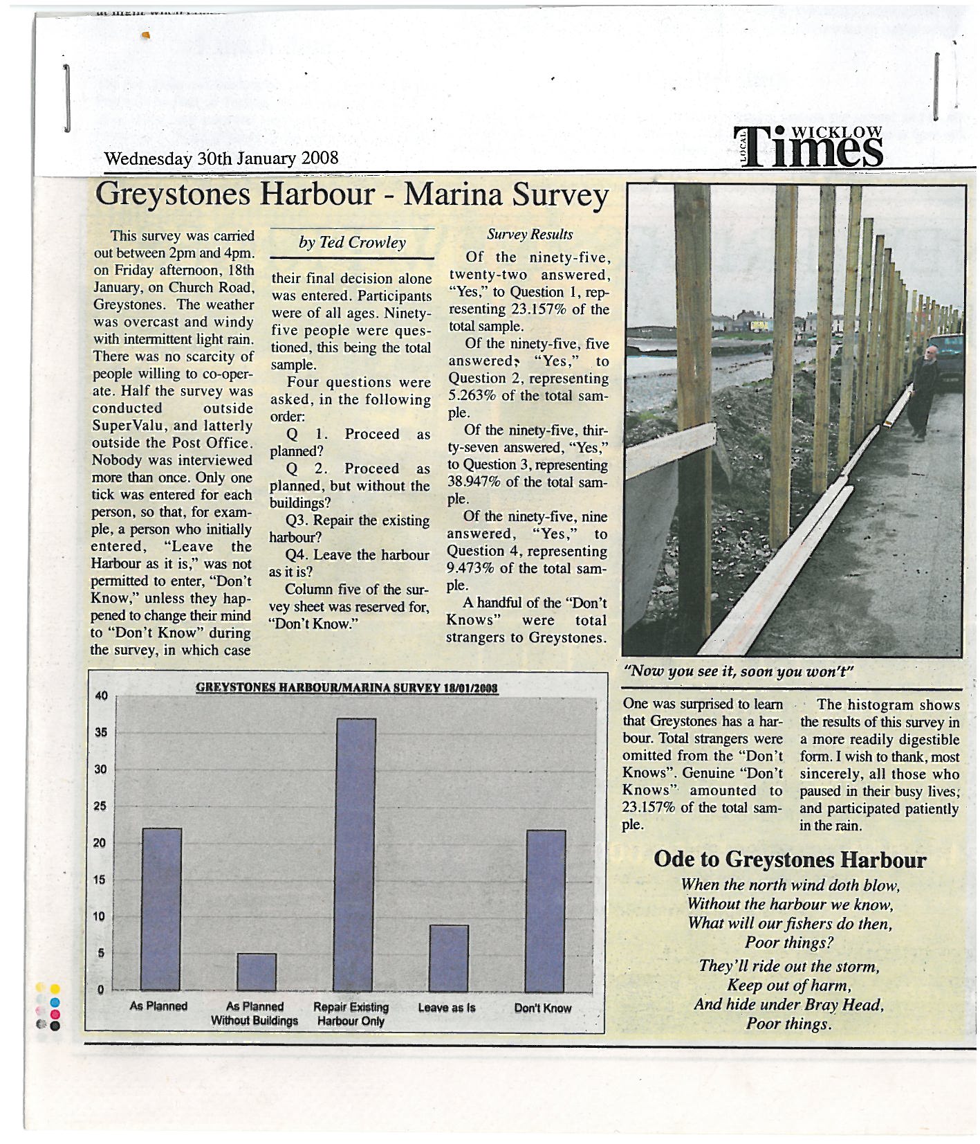 It is obvious to all that some agreement was reached with them that the developers would compensate certain people for the loss of their seaview which meant a lot to them and rightly so,this is why a valuer was brought into the hearing.So for the Greystones Chamber to suggest that the rest of the people of Greystones supported the revised plans is simply not true when a survey was carried out between 2:00pm and 4:00pm on a friday afternoon the 18th of january 2008 on church road Greystones outside the shops and the Post Office.Where the findings of the survey made very interesting reading where 95 people out of 37 answered yes to question 3 which was repair the existing harbour only which was representing 38.947 per cent of the total sample of the peoples views which put them at the top of the bar chart leaving the four other questions way behind this survey was conducted the same day the hoarding went up around the harbour and clearly represents the true feelings of the people who were part of the six thousand objections that still hold the same views which can not be covered up.The Greystones harbour marina survey is at the bottom of this statement for your consideration which expresses the true wishes of the people of Greystones and of the Greystones chamber who want you to believe otherwise.