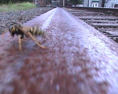 An abandoned railway track runs through the town of Beacon, in upstate New York. A miniature camera mounted on a small machine built to ride the track records a long, extreme close-up tracking shot of one of the rails as it enters, passes through, and leaves the town. As the machine carries the camera along the track (as the track tracks itself), the sun sets and the piece ends in darkness.