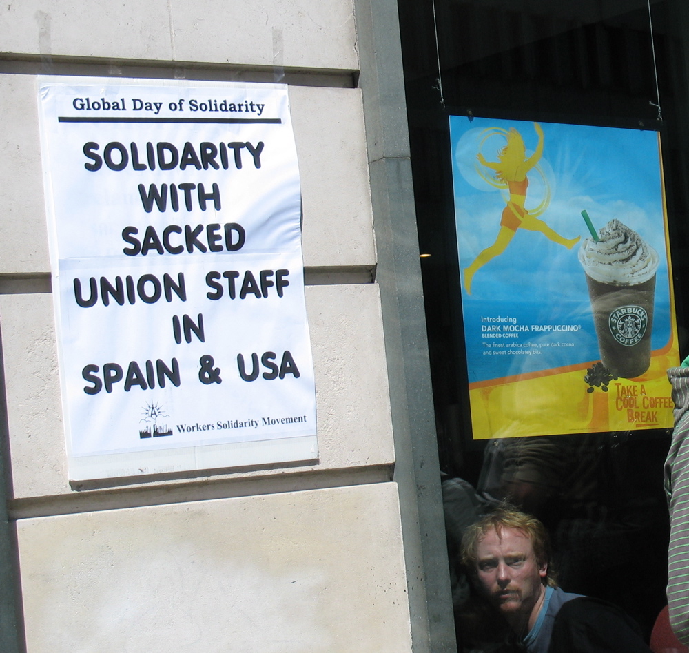 On July 5th 2005 the IWW in Grand Rapids and the CNT in Seville called for a world wide day of action on Starbucks restaurants. We know people have many issues with Starbucks from their flagship role on Capitalist Globalisation to their overpriced cup of froth laughably posing as coffee. This day of action, though, set out not to attack the company per sae. Our aim was to encourage workers within it to get organised and unionised or, at least, to start thinking about it. Specifically we were supporting the call for solidarity for Cole Dorsey fired for organising workers into the IWW in Grand rapids in the USA and Monica: organising for the CNT in Seville Spain.