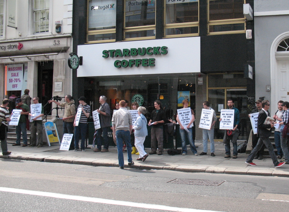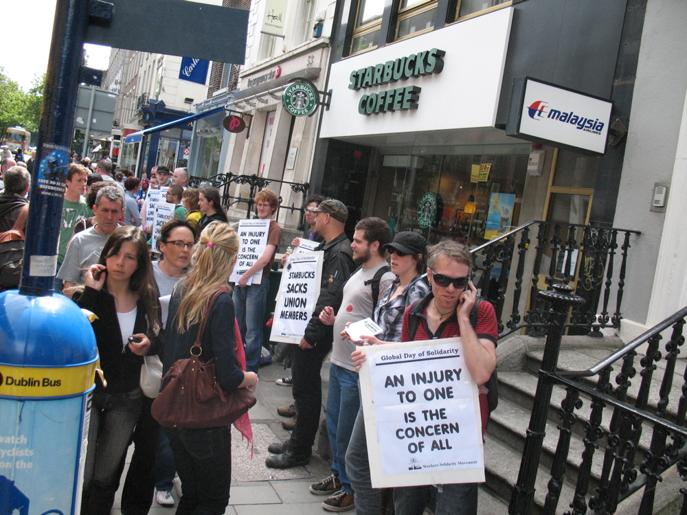 Today’s protest was organised at short notice by the Workers Solidarity Movement (an anarchist organisation of trade unionists, social justice campaigners and customers who would prefer to drink their coffee in unionised cafés). http://www.wsm.ie