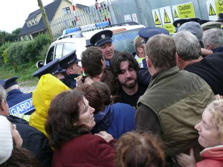 ![]() More heavy-handed Garda shenannigans at Glengad today as Shell to Sea protests continue Gardai have illegally detained two protestors in the back of one of their vans as they continue to use 'force' to police protests in Glengad Co. Mayo today. People were kicked, punched and dragged by the hair by Gardai as they attempted to break a protest at the gates of the Shell compound in Glengad this morning, according to initial reports. Solidarity Campers and local residents attempted this morning to blockade the Glengad compound, in another protest to show how unwanted the Corrib Gas project is in the 'receiving community' in NW Mayo. At approximately 7am this morning, local residents and Solidarity Campers gathered at the gates of the Shell compound in Glengad, Pollatomish, Co. Mayo, and formed a blockade of the site. Gardai arrived soon after and attempted to break the protest using 'force'. Initial reports indicate that Gardai have been kicking, punching and dragging protestors by the hair, as well as pushing protestors and other forms of rough handling. Gardai also employed verbal abuse and malicious insult in their policing effort, with particular attention paid by them to prominent locals. The violent behaviour of a certain Garda MY 117 has figured prominently in early dispatches from the protest line. |