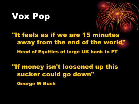 While we're on the subject of analyses of the crisis and, more specifically, ideas of what kinds of tactics we could use to take the initiative against the usual capitalist tactic of making the workers pay for their crisis, here's a link to notes from a recent talk on this topic by my old Yorkshire comrades from the Free Association (also known for their part in the Turbulence project).