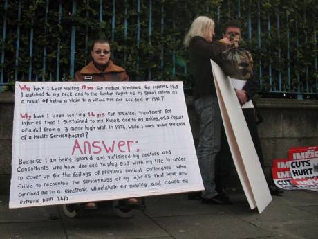 A good turnout; marches & high-visibility actions are necessary to remind people of what's happening (or in the case of the lady in the wheelchair, not happening), & that they need to do something to stop the ruling asses from destroying what Health Service remains. Fair play to all who gave their time to support patients & health workers.