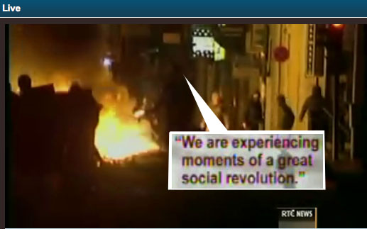 In todays headlines on Democracy Now! there was a brief overview of the Greek riots which included the following statement "We are experiencing moments of a great social revolution.” which, it seems, was uttered from Panagiotis Sotiris, 38, a spokesman for Uniting Anti-Capitalist Left, a coalition of leftist groups which helped take over the Athens Law School Monday.