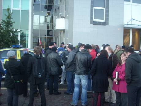 About 200 people joined the latest DAWC action, a march through the city centre, in desperate weather yesterday afternoon. It was announced at the end of the march in Guildhall Square that a mass petition will be taken up over the next fortnight calling on Raytheon to get out. The intention is to show the city council that there's solid support for getting Raytheon out. Surprisingly, this has never been done on any serious scale.