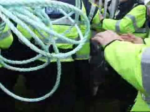 At present there have been some "arrests " of supporters at tonight action so far. Figures at present range from 6-8. These people are being physically detained but the cops are refusing to officially arrest them, or at least refusing to comment publically that the arrests have been made, and won't tell observers which Garda station those detained are being taken to. Garda seem to be deliberate targeting people from outside the local area, and avoiding arresting local members of the community. It has been suggested that this make much better media coverage, no doubt some of which we will see in tomorrow papers. There is a prison van, the type used to carry prisonsers to court, inside the compound where Shell and security staff work. Whilst there is movement of cops in and out of the van, it is unclear if people are being detained in it at the moment.
