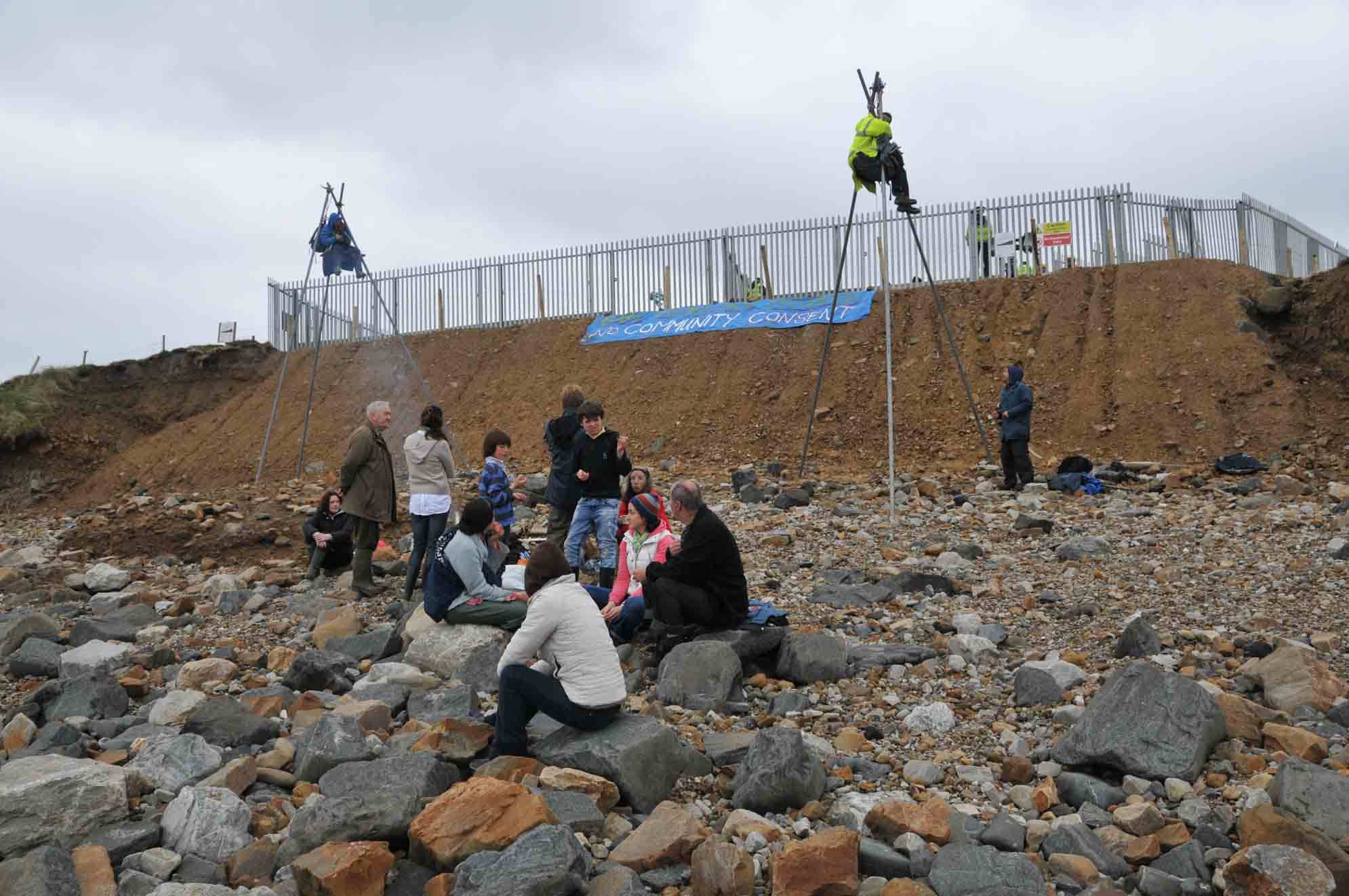 The two people on the tripod came down of their own accord at 5:30 yesterday evening after 12 hours up on the tripods. At this stage all site workers excluding security had left the compound for the day. The two climbers then left the area along with supporters carrying their tripods unaccosted by the watching Gardaí. The beach was patrolled by Gardaí and Security working side by side for the rest of the night.