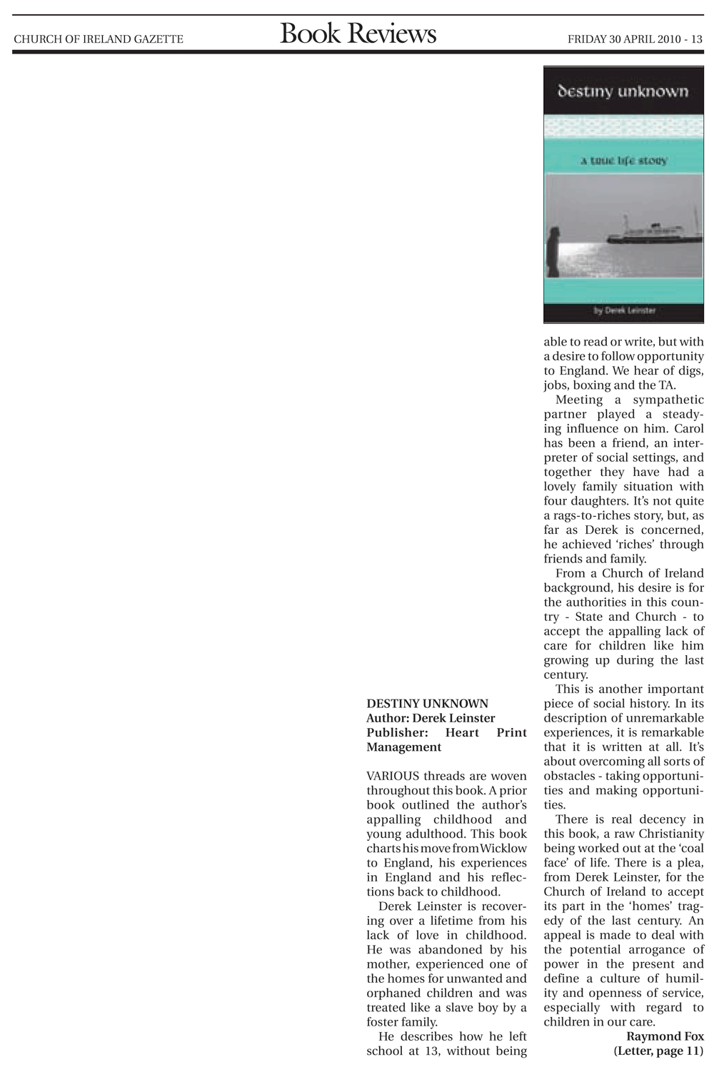 Derek Leinster - book review Church of Ireland Gazette May 2010