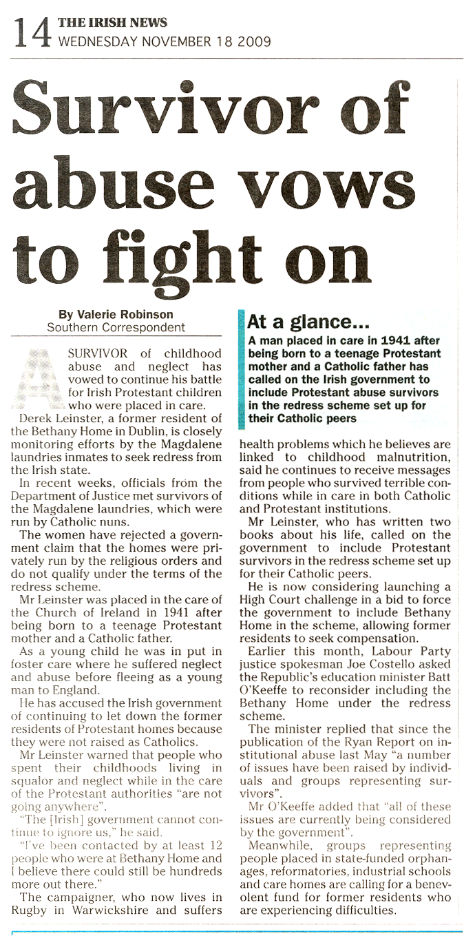 Derek Leinster - Bethany Home survivor - Irish Times - 30 March 2010
