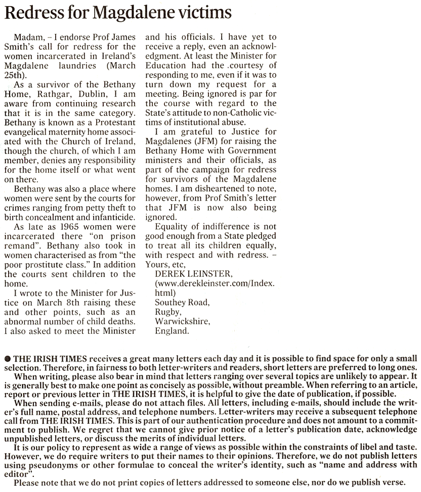 Derek Leinster Letter Irish Independent 26 March 2010