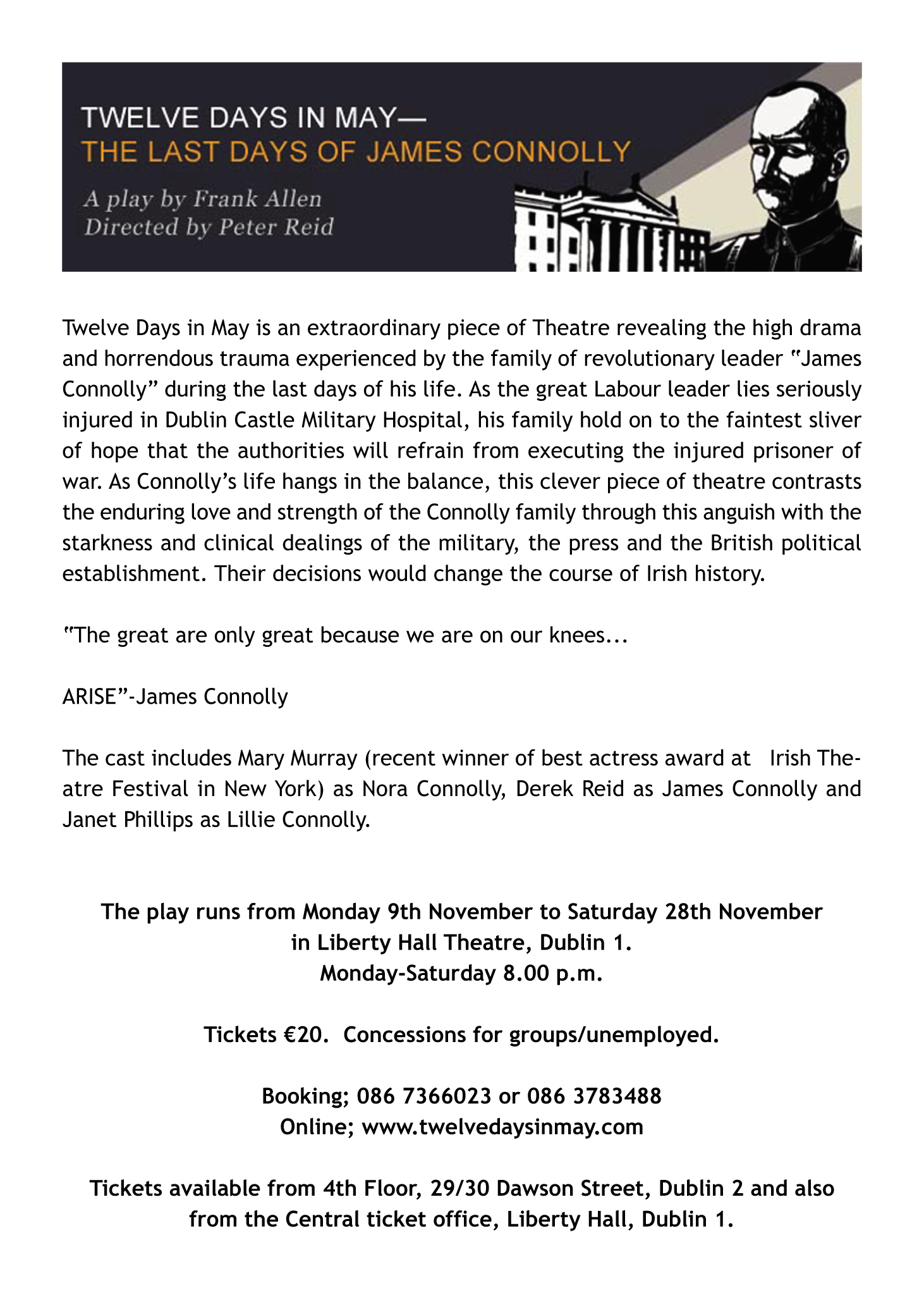 I saw this play last week and I thought it was a beautiful piece of theatre. I found it very moving even if it is heavy going at times. It brought history to life. The production though not without it's faults did the play justice. I did not get a programme but some of the acting was excellent particularyly the actresses who played James Connoly's wife Lillie and his daughter Nora. Also there is a terrific portrayal of William Murphy, who ran the Irish Independent during the the 1916 rising. I would reccomend this play highly.