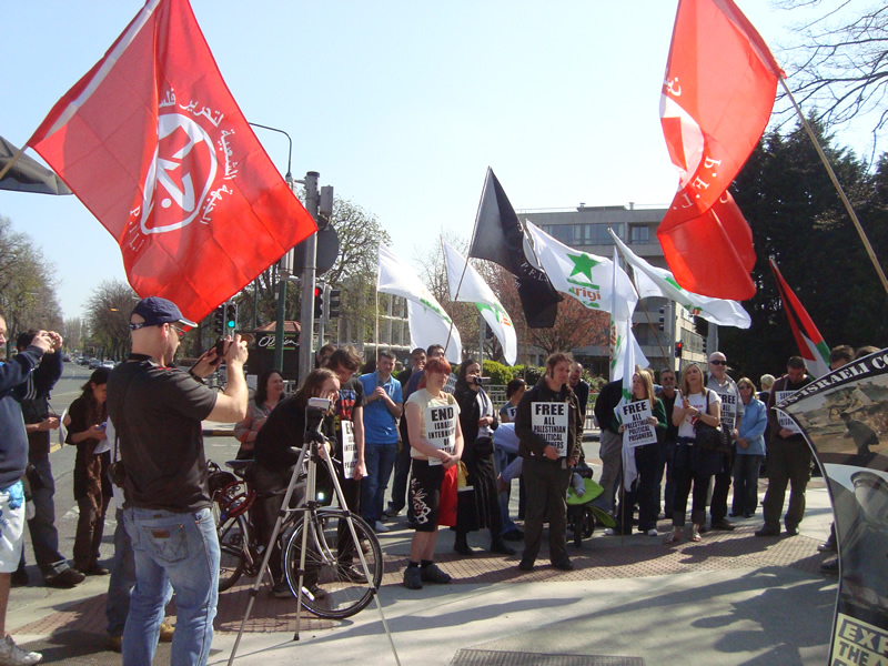 Palestinian prisoners' solidarity demo outside the Israeli embassy (Dublin) The demonstration specifically focused on the cases of two prisoners - Ahmed Sa'adat, Secretary-General of the Popular Front for the Liberation of Palestine (PFLP) and Abdallah Abu-Rahmah, coordinator of the Bil'in Popular Committee Against the Wall (see: http://www.popularstruggle.org/freeabdallah).