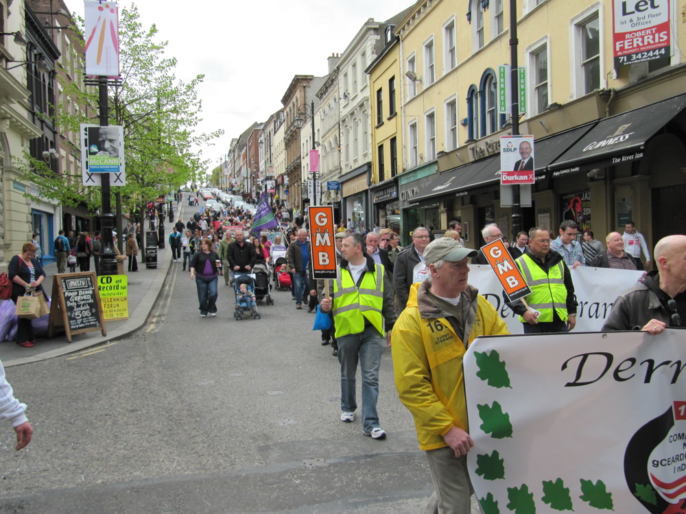 In a development that may well herald the gathering of momentum in the fightback against cuts and job losses in Derry and the north west, around 100 people marched to celebrate May Day, on Saturday May 1st. This was the first such march in the city in 8 years, and with a hundred plus people taking part in a march, and greater numbers at the rallies before and after, it was regarded as a successful event.