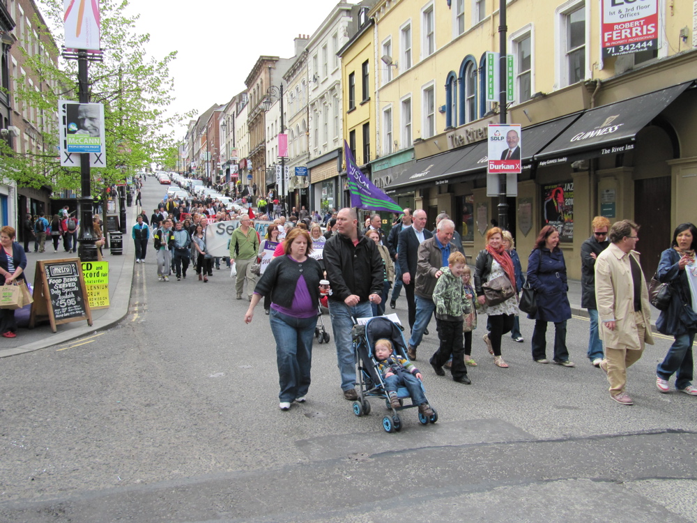 The march itself was a spirited and colourful demonstration of the range of issues, groupings and interests represented, spearheaded by a samba rhythm and guitar musical squad led by Paddy Nash. The music and vocal chants of “they say cutbacks, we say fightback” and “defend every job, fight every cut” gently but defiantly rocked a city that otherwise seemed to be slumbering through a jazz festival while in the throws of a recession.