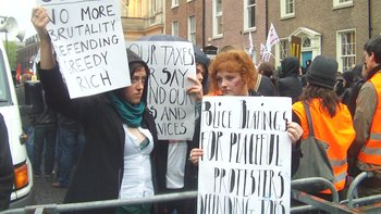 Half way through the interview, James O'Toole (a member of the SWP) points to Richard Boyd Barrett (a member of the SWP) and says 'groups like Richard's People Before Profit'. Are they both ashamed to admit their membership of the SWP or are they trying to disassociate themselves from Mary Smith (another member of the SWP) who was one of those injured by a garda baton and from the people carrying SWP flags who were to the fore in the attempt to push through the gate?