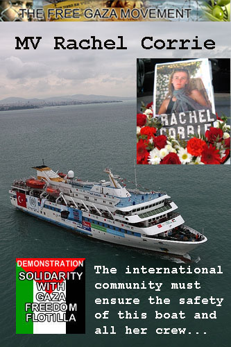 Solidarity to all on the Rachel Corrie and may they succeed in breaking the siege . Already they have made people aware of the whole rotten situation in Palestine and Israel - people who had never heard of Palestine/Gaza except from the lying propaganda of such as Zion Evrony and his fellow travellers in Ireland.