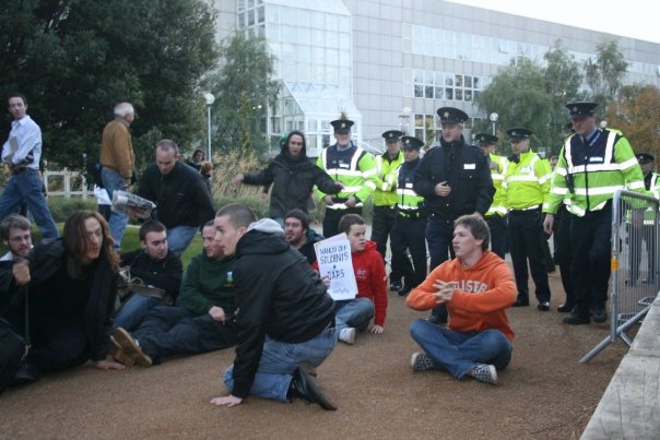 Gary Redmond himself has taken part in sit-down protests, including the one shown here, called by, and organised by Free Education for Everyone. The images in this post are from a FEE blockade in UCD (supported by UCDSU) at the arrival of Brian Lenihan in 2008.