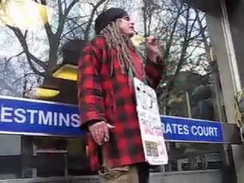 I got some general directions from those at the cafe, dumped my excess anti-Trident related placards on Dan and ran off to Bond St. tube, texting folks for directions from Westminister tube to the court once I surfaced. Got off tube and started running in what I thought was the general direction, asking a few folks I judged could cope with a large dreadlocked man invading their space. I'm not the human compass type! I'm good at asking for directions, but hopeless at listening to the answers, I'm a little deaf and all these weird English accents don't help none.