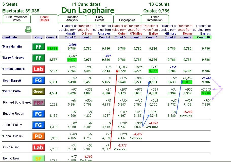 To help illustrate the dynamics, the image below is a screenshot below from the count for Dun Laoghaire in May 2007. This was a 5 seater with 11 candidates. In this constituency there was an interesting fight between Ciaran Cuffe (Green) and Richard Boyd Barret (People Before Profit) for the last seat. Even though PBP had more 1st preference votes, it was on the 10th count that Cuffe picked up 70% of the surplus votes from the FG candidate elected in the previous count (see purple arrows). The count data shows on the elimination of Oisin Quinn (Labour) that about 50% of the next preferences went to another Labour candidate, but the rest got split amongst FG, GP, PBP. Here you can see the benefit for FG of running multiple candidates because they probably picked up more votes with the three candidate than if they had one. Later in the 7th count, the bulk of the transfers from Baily (FG) stay with FG and again the same thing in count 9. Besides an obvious strong vote for FG, you would have to admit brand loyalty in terms of the FG party brand keeps people on track. So there are two processes going on. One is voting for the person and the other is voting for the party. Small parties and independents find it hard to benefit from this. It is quite possible that some of the people who voted for FG here had given FG candidates at least their 1st and 2nd preference votes but that they have had other candidates down as 3rd, 4th and 5th but these never got used. So say someone had Baily FG (1), Regan FG (2), and Labour (3). From the counts, we see 2nd preference only got used in count 9 and their 3rd preference never got used at all. If they really wanted someone else, they could have put them first and had they got eliminated by putting FG 2nd, they would still not suffer the withdrawl symptoms of abandoning FG presuming that is where they are politically.