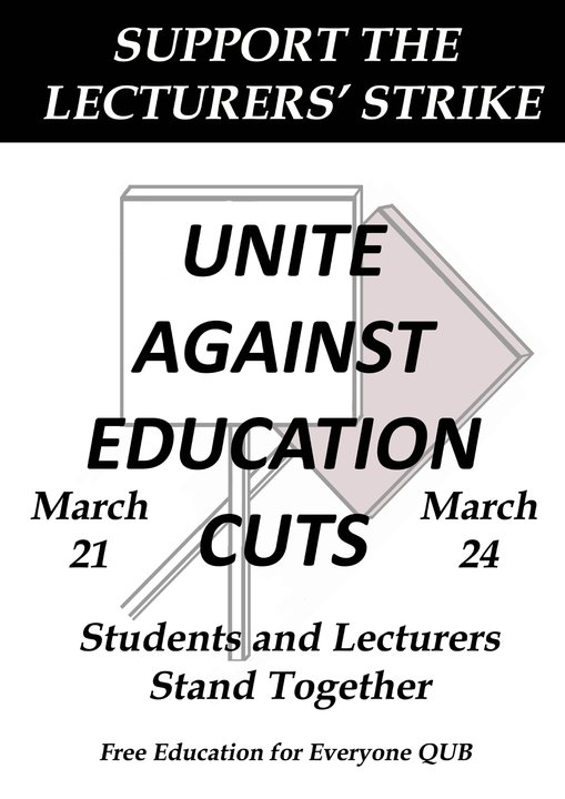 ![]() Free Education for Everyone (FEE) QUB have called on all students to support striking lecturers by not attending class on Monday 21st and Thursday 24th of March. Added to that FEE QUB call on all students to attend their nearest picket line on both strike days and to actively support their lecturers. The implementation of draconian cuts in the North are soon to become a reality with severe attacks on every sector within society. Citizens in the North are expected to lie down and accept job redundancies, poorer resources with less funding, pay cuts, the slashing of benefits and an array of additional crippling changes in the coming weeks, however upcoming protests are doing quite the opposite; rather than shutting up and taking it, people intend to send a very clear message to the Assembly in the North that they are not willing to stand by and allow people to suffer for a mess caused by bankers and politicians . A substantial effort is being made by groups within the education sector to fight back against over £87 million of cuts and next week this will be accelerated by direct action called by the University and College Union (UCU). |